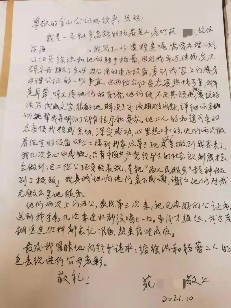 前幾天,上海市金山公證處收到了一封手寫感謝信,來信人是苑老伯,家住金山區石化街道。