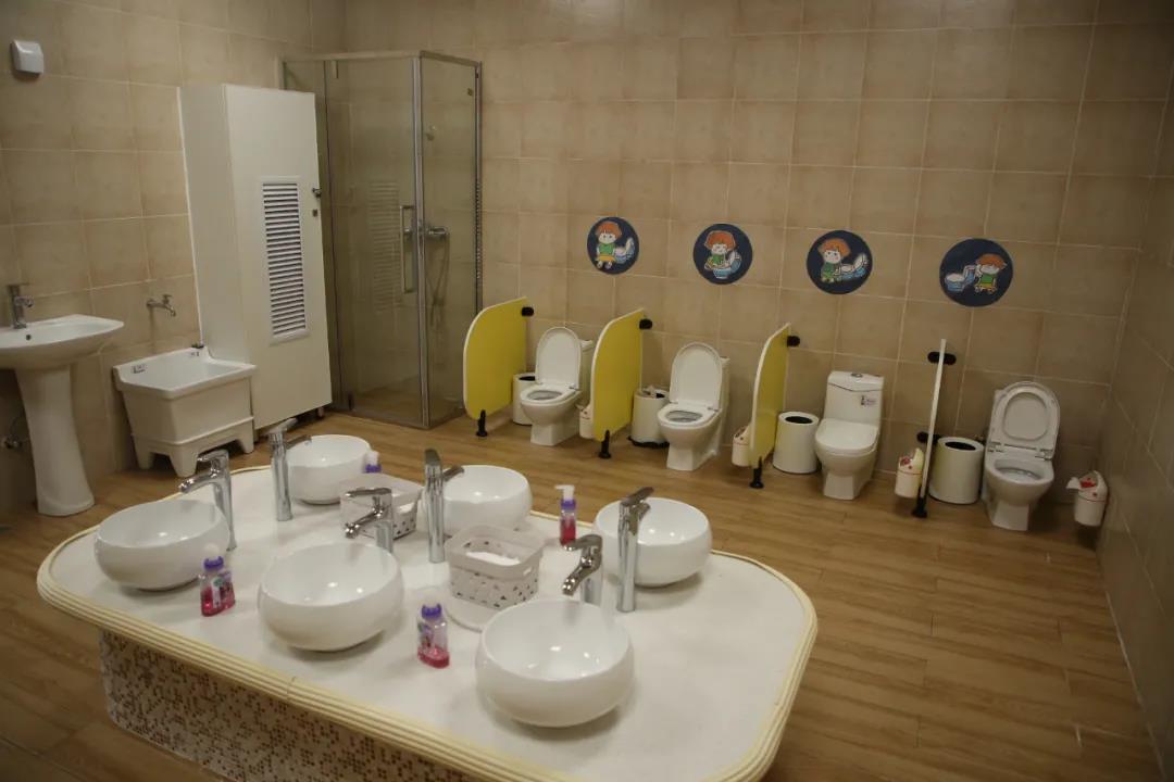 托班的孩子年齡大多在24個月到36個月之間,針對這個年齡段孩子的特點,托班教室內洗手臺邊角都貼了防撞條,廁所蹲位和小便池也比小班教室的更低一些。孩子們午睡的床是竹編搖籃式小床,沒有尖角,安全又溫馨。