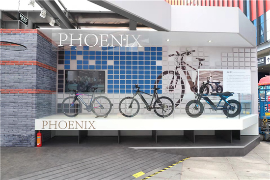 鳳凰自行車區域:極富年代感的青磚紅墻,被演化為極具現代感的藍白撞色,以此襯托出自行車領域的最新科研成果——三款進博首發產品。一側的電視機,播放著近30年來各類經典影視劇作品中鳳凰自行車的著名場面,另一側則是鳳凰最新研發的鳳凰電動輕便摩托車的“劇照”。
