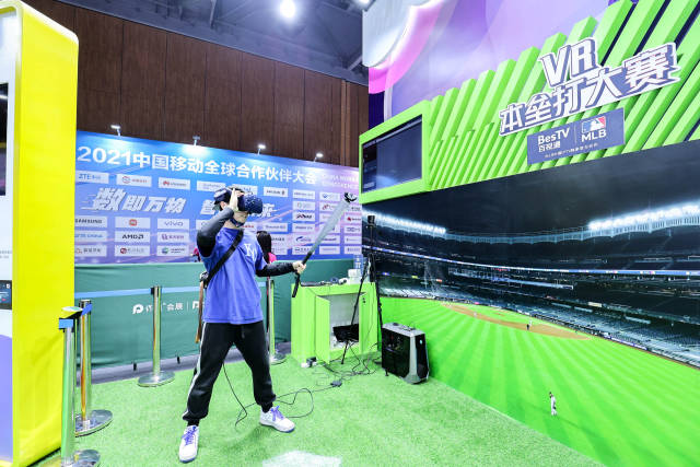 元宇宙概念火熱,百視通也在VR領域的深耕與探索,讓互動體驗持續升級。展臺現場,特設“ MLB美職棒大聯盟”VR本壘打大賽體驗區、MLB潮牌帽飾展示墻,觀眾們戴上VR眼鏡,拿上揮桿即可置身本壘,感受職業棒球手的熱血與激情。