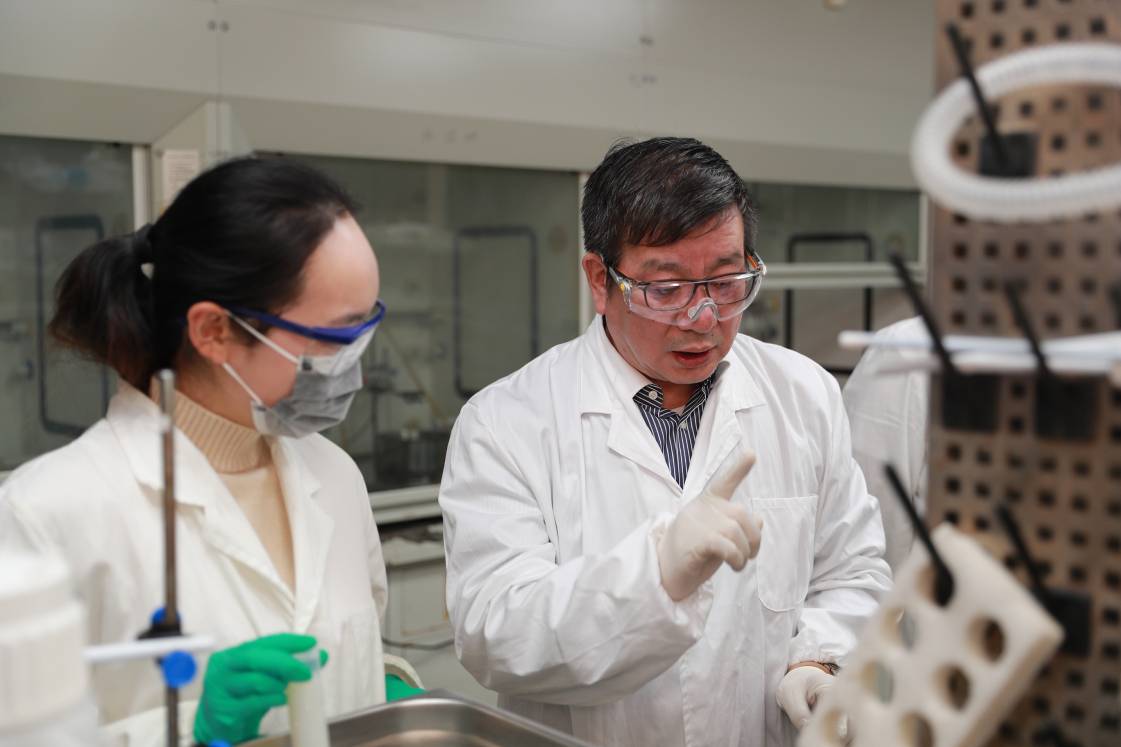 趙東元院士(右)在指導學生實驗。復旦大學供圖