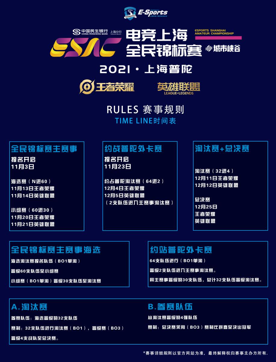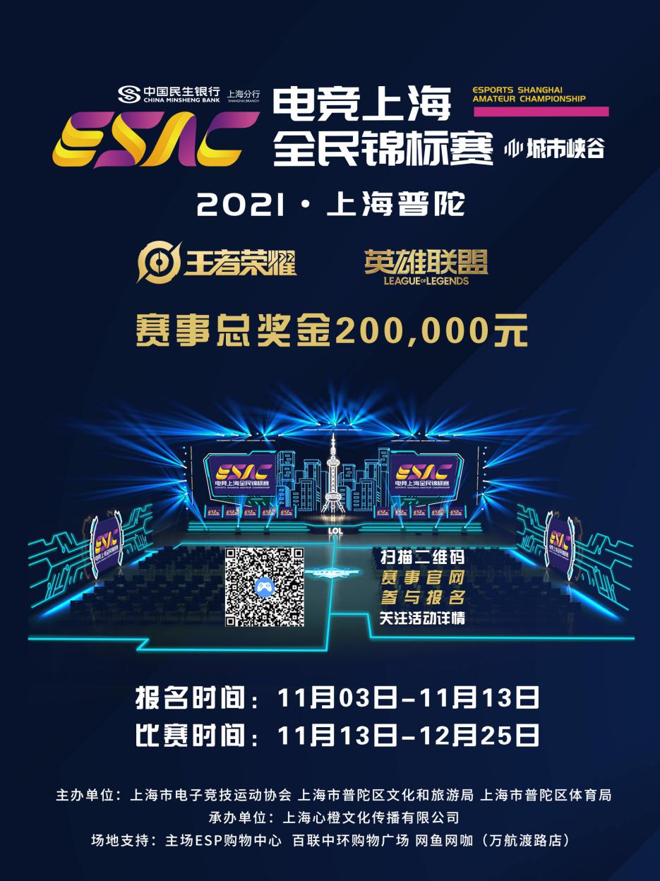 該賽事作為助力上海建設全球電競之都的重要措施之一,由上海市電子競技運動協會、上海市普陀區文化和旅游局、上海市普陀區體育局聯合主辦。賽事項目為《王者榮耀》《英雄聯盟》,賽事總獎金額為20萬元,整個賽程持續至年底,計劃將在普陀的熱門商圈和賽館----主場ESP購物中心、百聯中環購物廣場、網魚網咖(萬航渡路店)展開線下角逐。參賽隊伍可通過多維度的場景和多層次的體系,體驗職業賽事策劃所帶來的激烈比拼。據悉,這是上海唯一具有政府背景,融合不同區域、不同項目的全民電競賽事平臺,旨在培育規范化、標準化的賽事品牌,營造健康、綠色、向上的良性氛圍,進一步構建本市電競賽事的完備體系。通過職業水準的賽事體系運作,集中展現申城電競全民參與的深厚氛圍以及電競產業的整體實力。