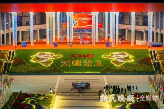 記者看到,南廣場5000平方米的大草坪及草坪上的“進寶”吉祥物、“CIIE”和“2021”字樣,都用燈帶勾邊。尤其是兩只“進寶”,用雙層燈帶進行了勾勒,從一號門及主通道處遠遠望去,在夜色中非常顯眼。