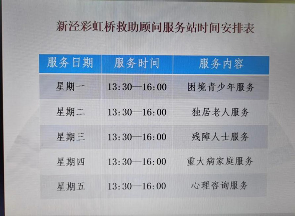 新涇彩虹橋社區救助顧問服務站位于泉口路66號新涇鎮社區事務受理中心2樓,這里有專業社工每周定點值守,為社區居民提供救助政策咨詢、心理疏導、個案幫扶等各類民生救助服務。服務站將打造為集救助幫扶、教育培訓、案例分析、心理疏導、減壓增能、技能提升等服務為一體的示范性、綜合性活動空間。