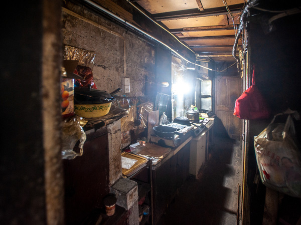 山壽里塘沽路124號,是居民李阿姨的家。破舊的木門里,一個簡單搭建的灶頭,一個只能沖澡的衛生間,沒有抽水馬桶,落滿灰塵的雜物堆滿角落。這間兩層的老房里共有3戶人家,都住在二樓,李阿姨和兒子蝸居在正中央的一個小房間里。一樓是公用的灶間,但由于面積實在太小,其中兩戶人家做飯的灶頭只好搭建在二樓的過道里,每到傍晚,老房里便煙熏火燎。最讓李阿姨無奈的是,每天都要上下坡度近60度的樓梯,雖然每次都小心翼翼地側身上下,但最近幾年,她仍從樓梯上摔下來近十次。