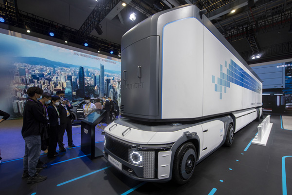 在汽車展區,中國首秀的氫動力智能無人運輸車受追捧。人民網記者 翁奇羽攝