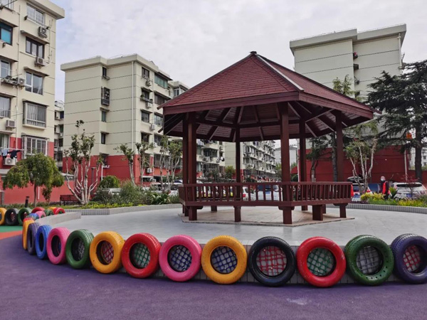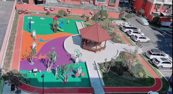 除了豐富多樣的健身器材,健身步道上鋪設著厚厚的橡膠顆粒,提升運動的舒適感和安全度,兩旁還種植了各種綠植花卉,整潔、寬敞、綠色的運動環境吸引著居民不斷投入到健康的運動中。而廣場中央的八角涼亭經過翻新,增添了不少桌位,使得居民在下雨天也能出來散心聊天。