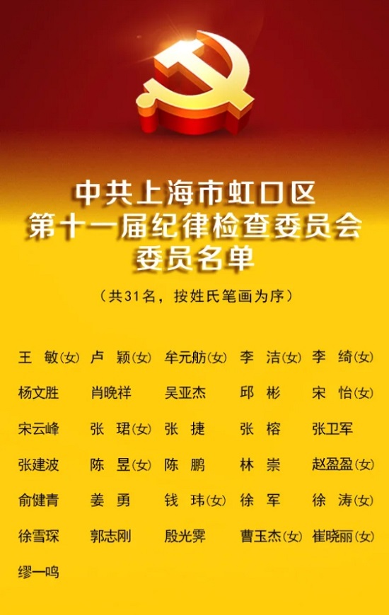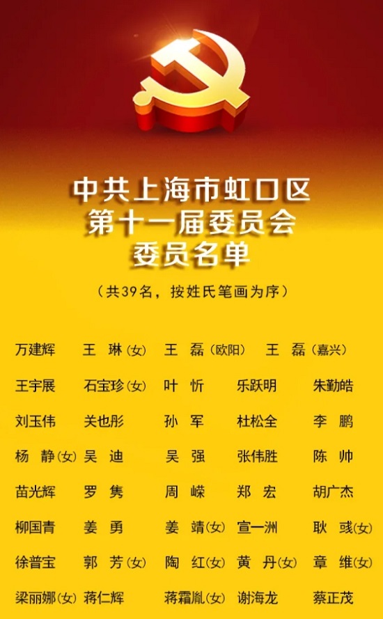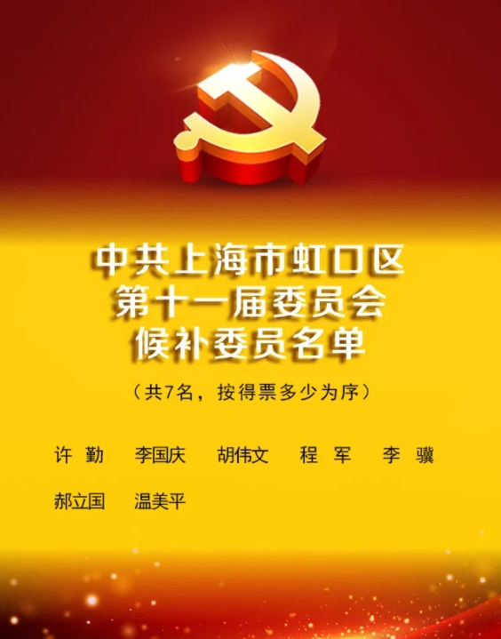 在大會監票人監督下,到會的348名代表以無記名投票方式,選舉出39名中共上海市虹口區第十一屆委員會委員、7名候補委員,選舉出31名中共上海市虹口區第十一屆紀律檢查委員會委員。