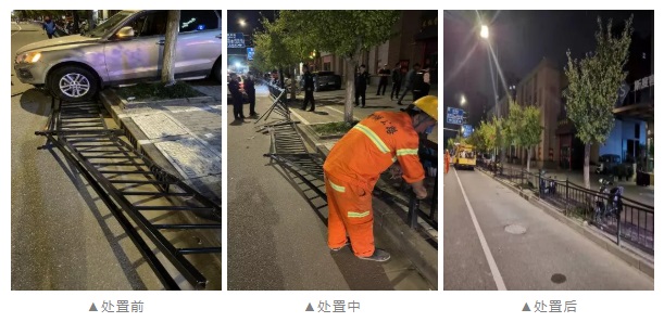 凌晨0:22,在淶清路 48號門前,有車輛撞擊非機動車護欄,造成護欄破損,長度達4米左右,對車輛行駛和過往行人造成安全隱患。前線指揮中心接報后,立即派遣應急機動中隊前往處置,0:45分案件處置完畢。從發現到處置,僅用了23分鐘,真正實現了24小時及時發現、快速響應、高效處置。