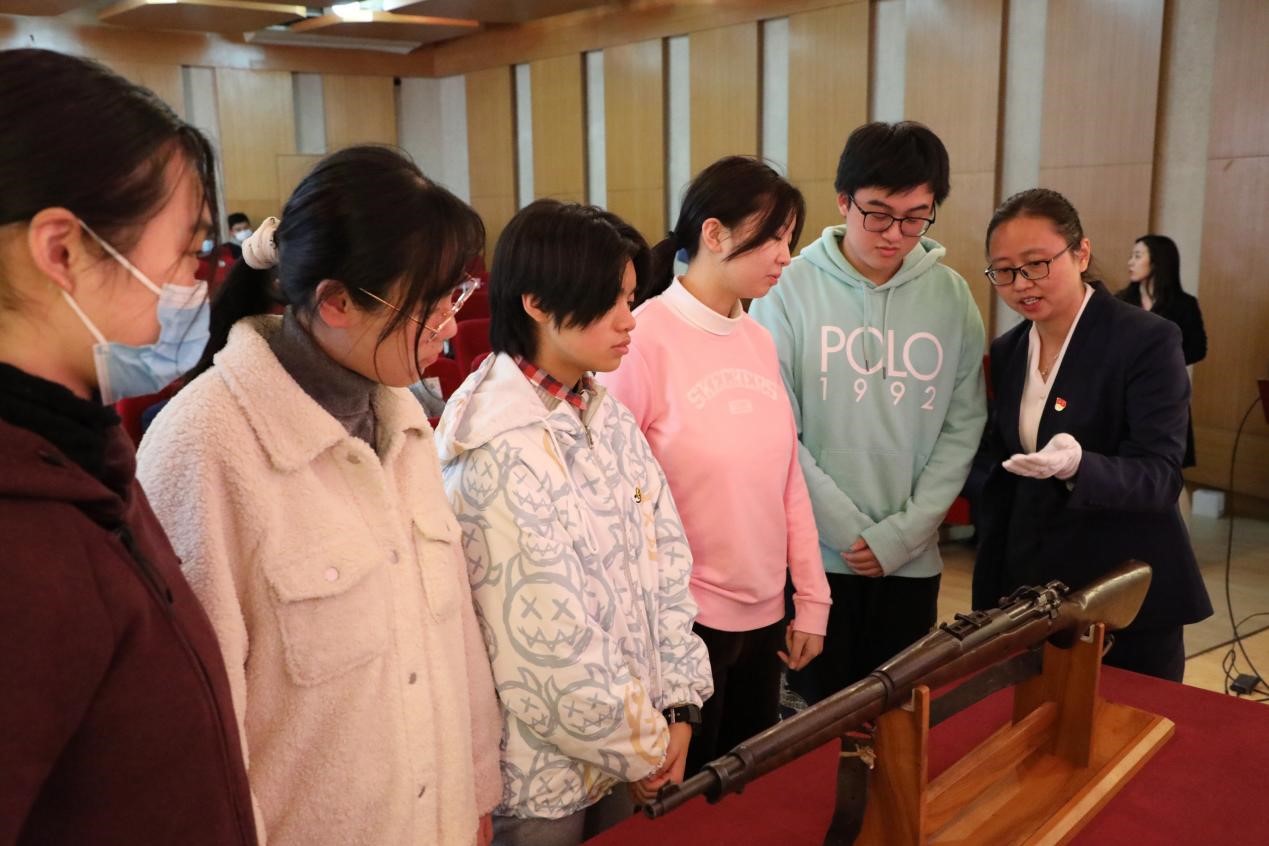中共一大紀念館宣教專員張欣怡現場講解了館藏文物M1903步槍,講述了中國人民志愿軍李增祥在抗美援朝戰場上僅憑這支步槍和五發子彈擊落美軍一架戰機的故事。