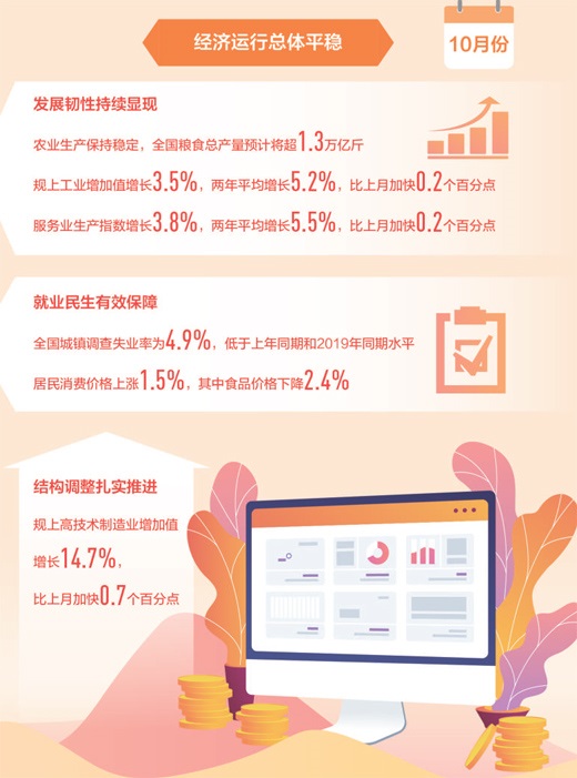 發展韌性持續顯現、就業民生有效保障、結構調整扎實推進……11月15日,國家統計局公布的10月主要經濟數據顯示,主要宏觀指標總體上處于合理區間。