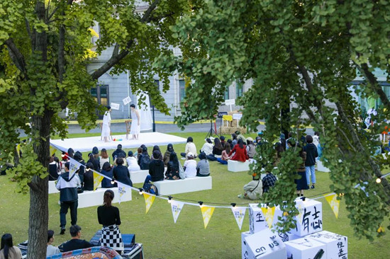 這是戲劇生活節的“青年競演”環節,共有3個高校劇社、2個白領劇社先后踏上草坪、走上舞臺。觀眾們并沒有正式的座椅,或席地而坐在蒲團上,或三三兩兩坐在略高的長條凳上,目光追隨著演員,心緒隨著劇情推進而起伏!白呓^眾,和他們對上目光的時候,一下就‘入戲’了!薄蛾P于16號機器人》有超過半數的演員是第一次登臺,開闊的自然環境和一樣熱愛戲劇的觀眾,迅速消除了他們的緊張。