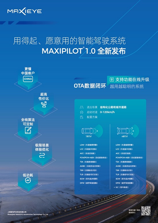 日前,智駕科技MAXIEYE面向行業發布了乘用車智能巡航類駕駛輔助系統產品MAXIPILOT 1.0,該產品將于2021年內在兩家乘用車品牌車型實現量產。從創新火種到科技平權,MAXIPILOT 1.0以優質的性能體驗和親民的價格,推進Level 2智能駕駛系統向更廣泛的乘用車細分市場(10-15萬元級別車型)滲透,以此踐行“人人可享”的產品理念。在技術演進路徑上,MAXIPILOT 1.0打通了感知、規控全棧自研技術鏈,實現各個模塊性能極致挖掘和深度協同,同時已完成OTA數據和場景閉環。