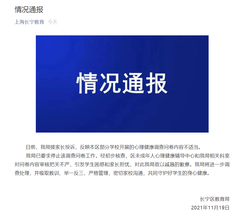 上海長寧教育局回應心理健康調查問卷涉不適當內容:已停止該調查問卷工作