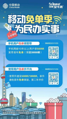 根據上海移動免單政策,現在,移動寬帶用戶升速至500M或1000M,即可享受升速包首年免費、第二年半價政策,相當于免費體驗升速千兆寬帶。如果是網齡10年以上的上海移動老用戶,現在新裝500M寬帶,還可享受感恩回饋寬帶費首年限量免單政策。