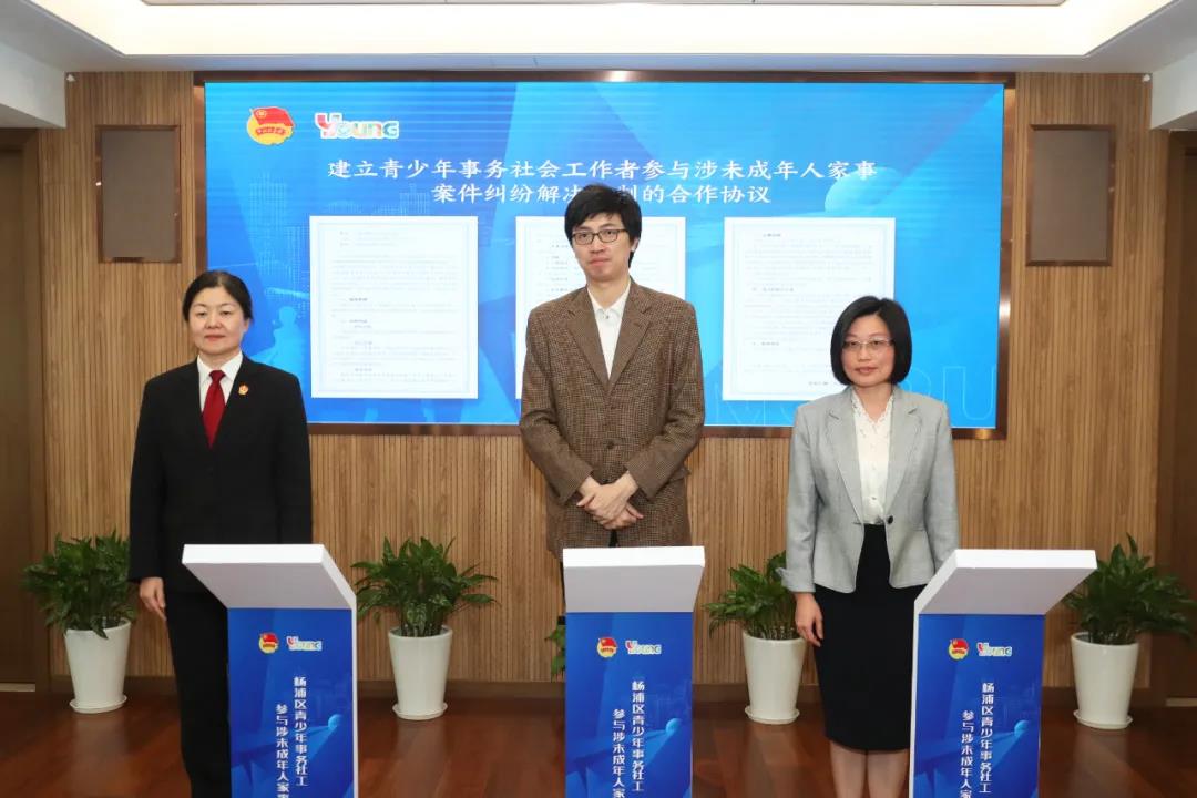 活動中,楊浦法院與共青團楊浦區委員會、上海市陽光社區青少年事務中心共同簽訂了《建立青少年事務社會工作者參與涉未成年人家事案件糾紛解決機制的合作協議》。根據協議,楊浦法院在審理涉未成年人家事案件時,可委托市陽光社區青少年事務中心,選派青少年事務社工,開展家事調查、調解、心理疏導、回訪觀護、探望監督、家庭教育指導等工作,在訴前、審中、審后全流程參與案件糾紛解決,形成“法官+社工”的家事審判新模式。