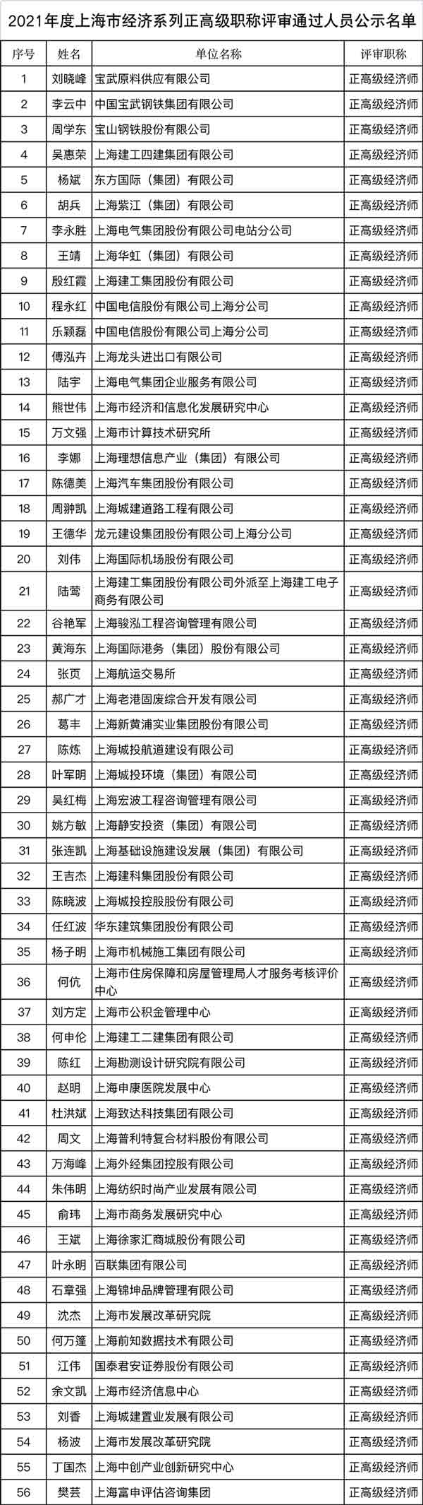 2021年度上海市經濟系列正高級職稱評審通過人員公示名單