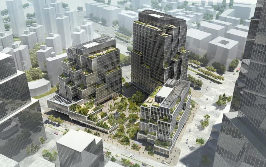 從空中望去,層層推進的建筑,將豐富的綠植從首層一直延伸到立面,形成多樣化的樓層露臺與屋頂花園。三棟錯落有致的辦公樓宇圍合出中央花園,形成一個寧靜和諧的綠色“山谷”。