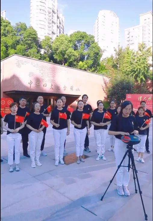 在中共四大紀念館廣場上,黨員們自學龜鼓集體演唱一曲《紅梅贊》,用朗朗歌聲贊頌走過波瀾壯闊百年征程的中國共產黨。