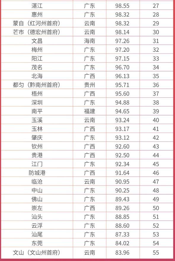 除了這些熱門城市以外,西雙版納州首府景洪、黔東南州首府凱里、大理州首府大理這些少數民族自治州首府所在的小城市也闖進前二十強,黔西南州首府興義、紅河州首府蒙自、德宏州首府芒市也進入前三十強。