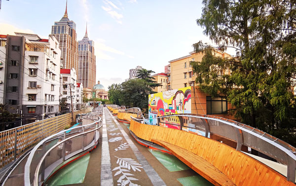 三是多樣性空間營造。針對曹楊新村小而精致的定位,創造性探索非典型性改造更新方案。如,在拆除廢棄后的原曹楊鐵路市場上打造了上海首座“高線公園”——百禧公園。通過三層的立體3K長廊設計解決空間狹長且窄的實際問題,最大程度增加活動空間和體驗感。設計中刻意保留了部分老墻面、老標識等,利用巧思的時尚設計讓歷史的紋理通過城市更新成為富有活力的一筆。又如,改造桂巷菜場,打造首個菜場美術館,讓藝術更好融入平凡生活。同時,嵌入“人情味、煙火味、好滋味”“三味一體”的數字化社區服務中心,成功實現空間和功能的“破圈”。