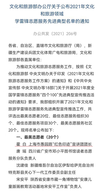 2021年文化和旅游領域學雷鋒志愿服務先進典型名單日前公布。共評選出最美志愿者20位、最佳志愿服務組織30個、最佳志愿服務項目30個、最美志愿服務社區20個。長寧區愚園路“紅色印跡”宣講團團長霍白入選全國“最美志愿者”。今天,就讓我們一起來了解霍白的故事……