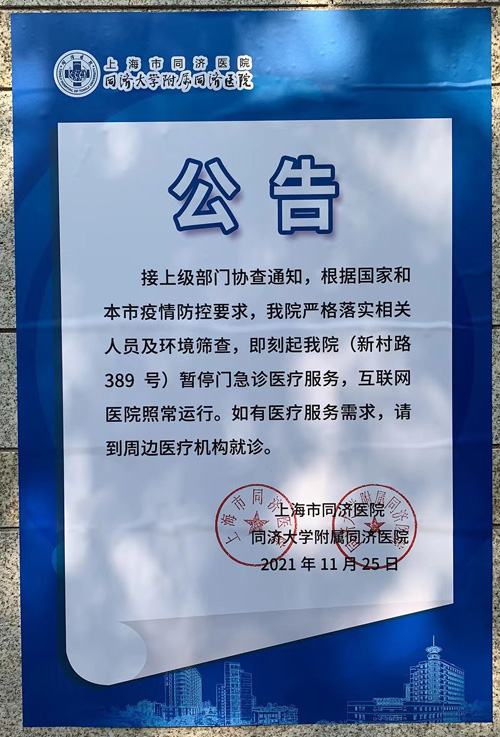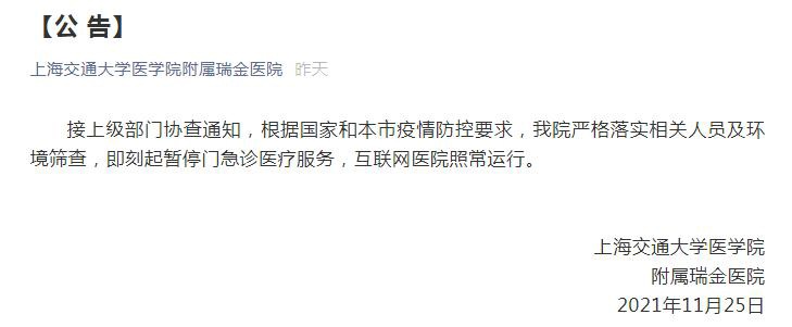 上海交通大學醫學院附屬瑞金醫院、復旦大學附屬中山醫院、同濟大學附屬同濟醫院(新村路389號)、閔行區中心醫院、復旦大學附屬華山醫院虹橋院區、普陀區人民醫院、上海交通大學醫學院附屬新華醫院、上海第九人民醫院、同濟大學附屬皮膚病醫院均發布公告稱,接上級部門協查通知,根據國家和本市疫情防控要求,嚴格落實相關人員及環境篩查,即刻起暫停門急診醫療服務,互聯網醫院照常運行。