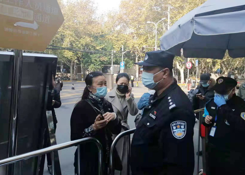 11月25日下午起,瑞金醫院配合疫情協查,緊急落實疫情管控措施。當天傍晚,瑞金醫院門口已圍起了護欄,58歲的朱耀明作為瑞金醫院的駐院民警,立刻加入到抗疫的第一線。他與院方工作人員一道耐心地向等候在院外的病患家屬們做著解釋工作。不少家屬送來了餐點和生活必需物品,經由消殺后,朱耀明和醫護人員把一袋袋物品送往指定放置點。