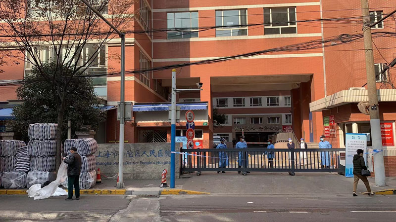 普陀區人民醫院已進行相關防控管制,人員暫停進出。在該院東南門門口,有貨運司機正在給滯留醫院的人員準備被褥。該司機表示,今天要給醫院準備100套被褥,明天看情況是否需要再增加。