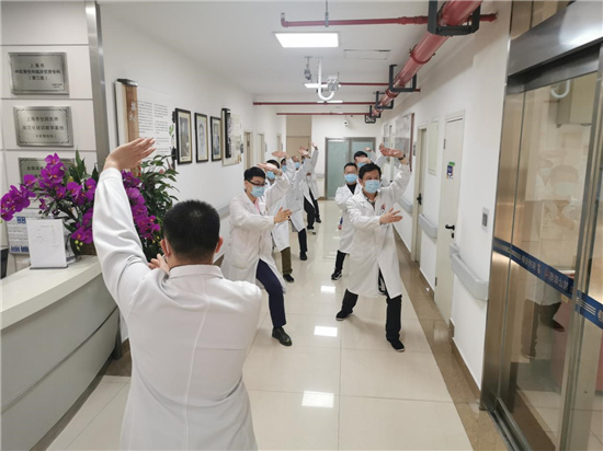 26日一早,瑞金醫院魏氏傷科病房里,醫生們照常進行魏氏傷科功法鍛煉