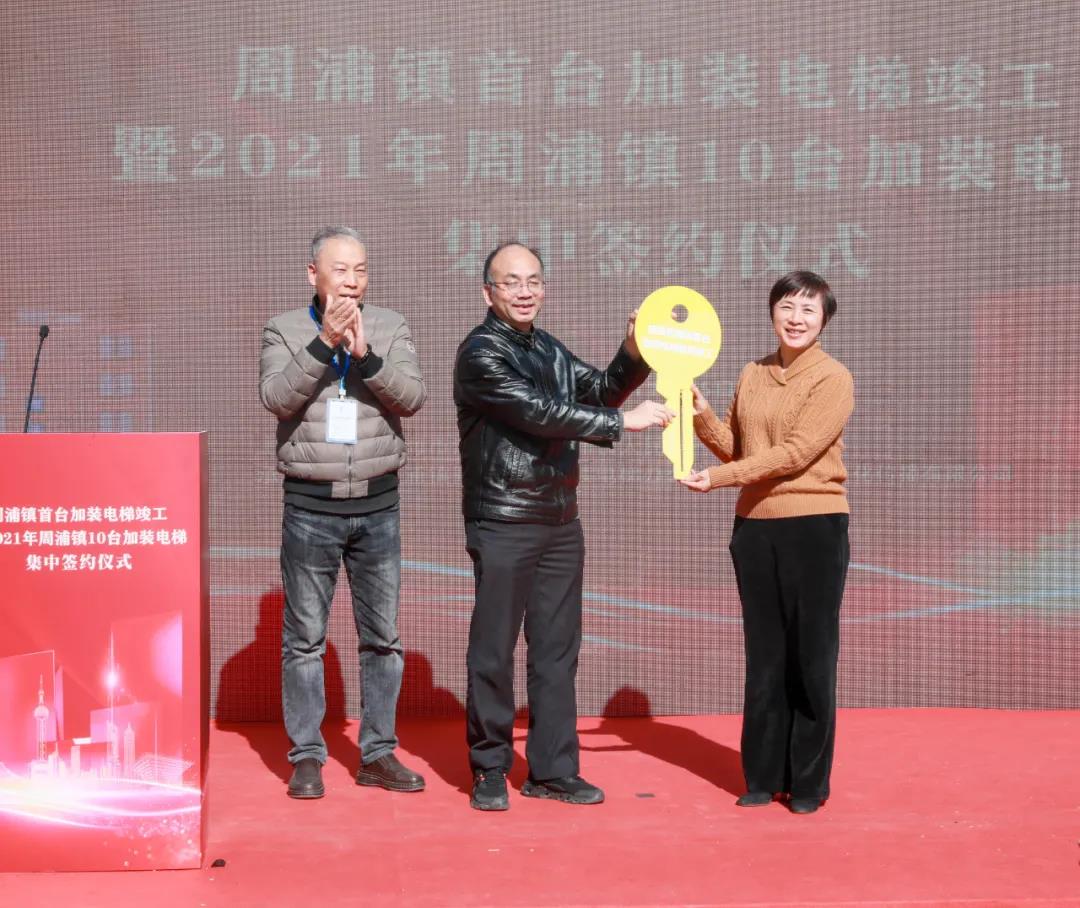 這是周浦鎮首臺竣工投入使用的既有多層住宅加裝電梯。當天,周浦鎮全鎮范圍內又有10個加裝電梯項目集中簽約。