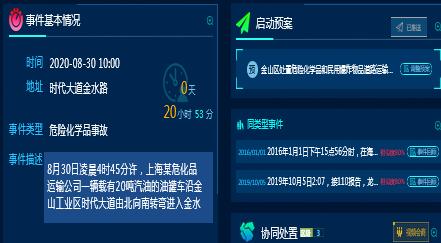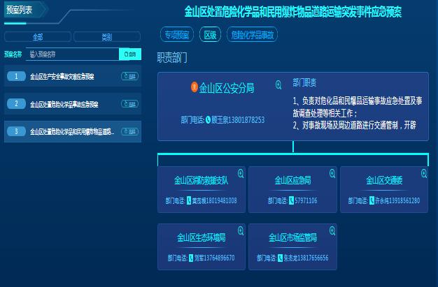 在“一張圖”上,可見公安110平臺有一條預警信息。信息顯示:在金山區某條路附近發生一輛裝載汽油的;愤\輸車輛側翻。系統依據事件信息,智能匹配推薦“金山區處置危險化學品和民用爆炸品道路運輸突發事件應急預案”。