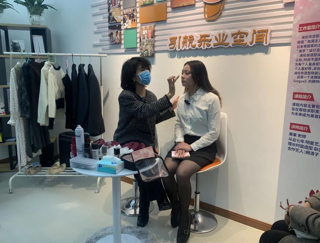 11月26日,楊浦區殷行街道在市光路1118號睦鄰中心開展“‘職’殷為你 引航新途”——引航樂業空間“1+X”賦能學院首期課堂暨新址啟動活動,F場,首期課程“時尚美妝行業入門基礎技能”手把手教大家如何化妝。