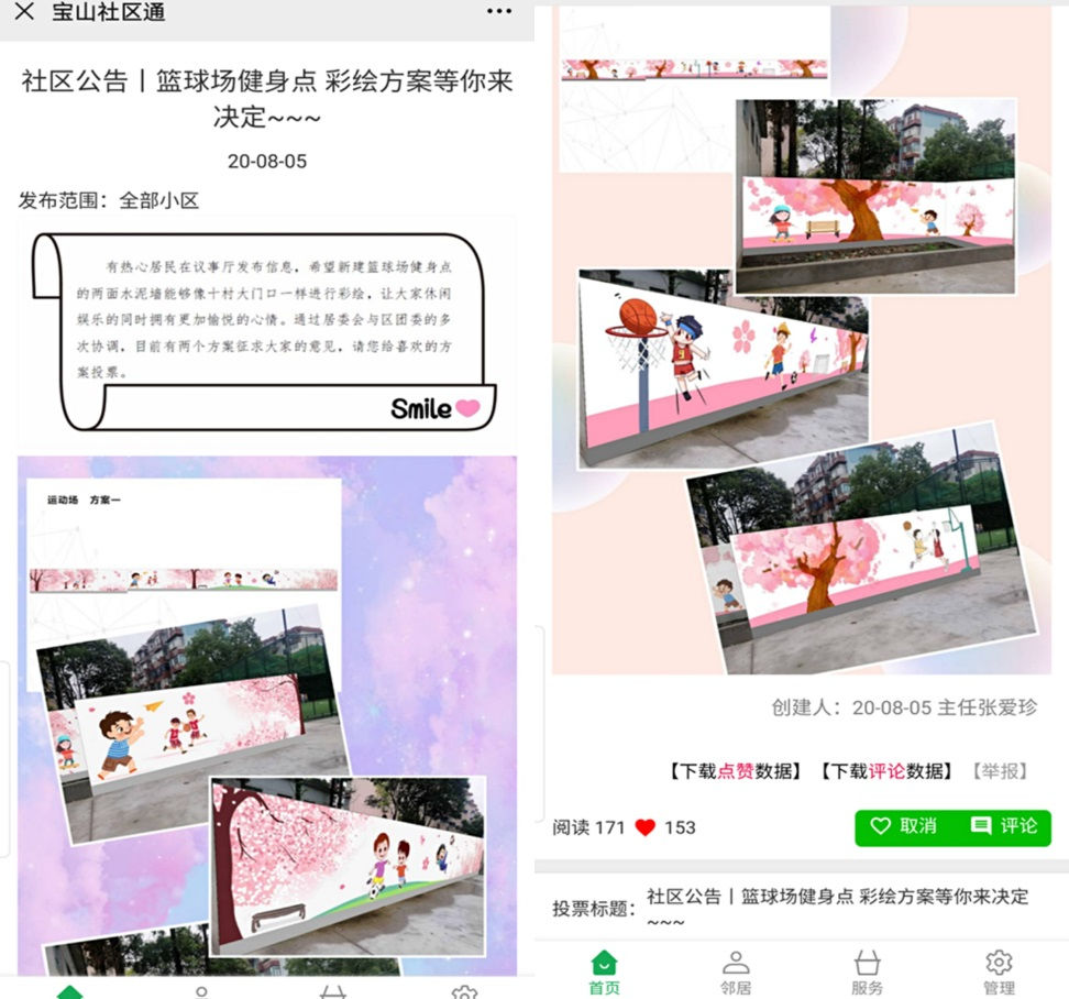 針對這個情況,242號樓的居民楊女士在議事廳中提出《籃球場新建健身點的提議》,得到了300多位居民投票支持,引起了居民區黨總支的高度重視,牽頭居委、物業和業委會開展線下調研,充分了解民情,傾聽民意。經多方合力,最終鏟除了這塊籃球場南側的衛生死角,新裝了健身器材,添置了座椅,種上了櫻花,原本的臟亂差變成了干凈整潔的健身點。不久,43號樓的郝先生在議事廳又發布了一則“籃球場健身器材那邊的墻有點單調”的議題,引起了居民們的圍觀和熱議,不少居民提出可以在墻面上進行彩繪涂鴉。經多次線上線下討論協商,最終根據居民的意見形成了兩套以全民健身為主題的彩繪方案,通過線上投票交給居民們決定。一周之后,籃球場健身點終于完成了華麗的變身,塑膠跑道內是嶄新的健身器材,大幅的墻面彩繪色彩亮麗,既美化了環境,也點亮了每個社區居民的心。