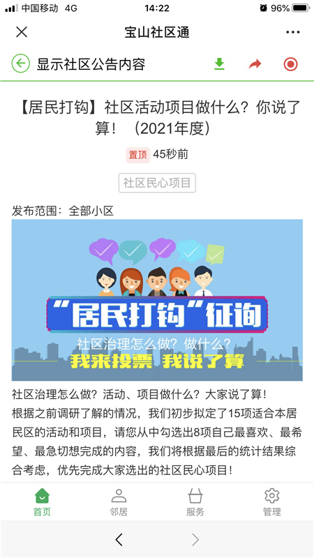 創新開展“社區民心項目”勾選,通過“居民打鉤”主動征詢民意,根據投票情況確定居民真正需要的社區項目重點推進。