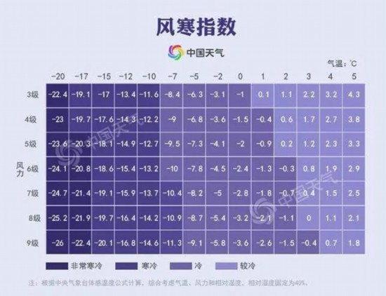風寒效應的威力有多大?根據中央氣象臺的體感溫度計算方法,當氣溫為5℃、相對濕度固定為40%時,如果刮起7級大風,體感溫度為2.5℃,疊加9級大風時體感溫度只有1.8℃,寒冷感直線上升。