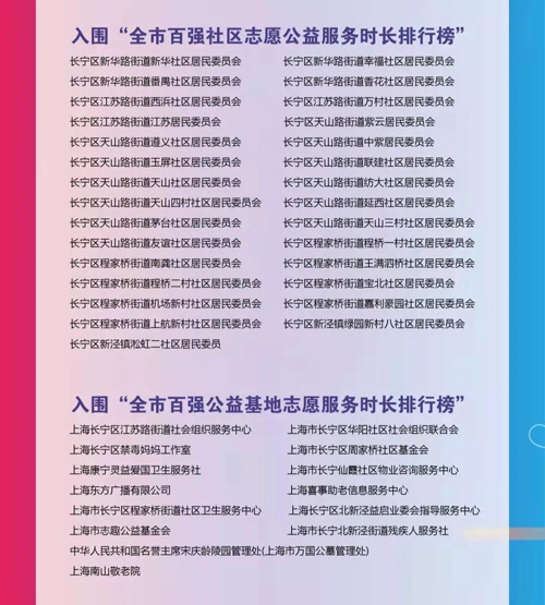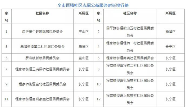 而在“全市百強社區志愿公益服務時長排行榜”上,長寧區程家橋街道8個居民區全部進入全市前12強,成績斐然。