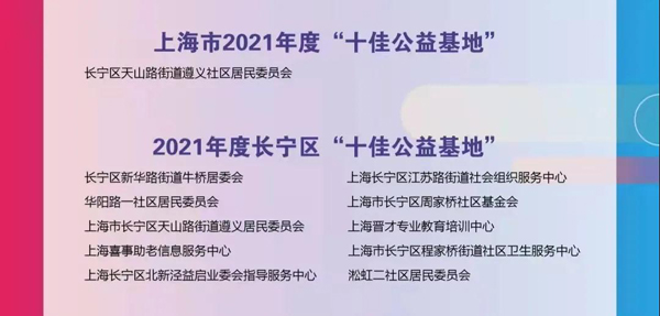 在2021年度“公益之申”評選中,長寧區天山路街道遵義社區居民委員會榮獲上海市2021年度“十佳公益基地”稱號。與此同時,長寧區注重樹立模范典型,評選出2021年度長寧區“十佳公益基地”。