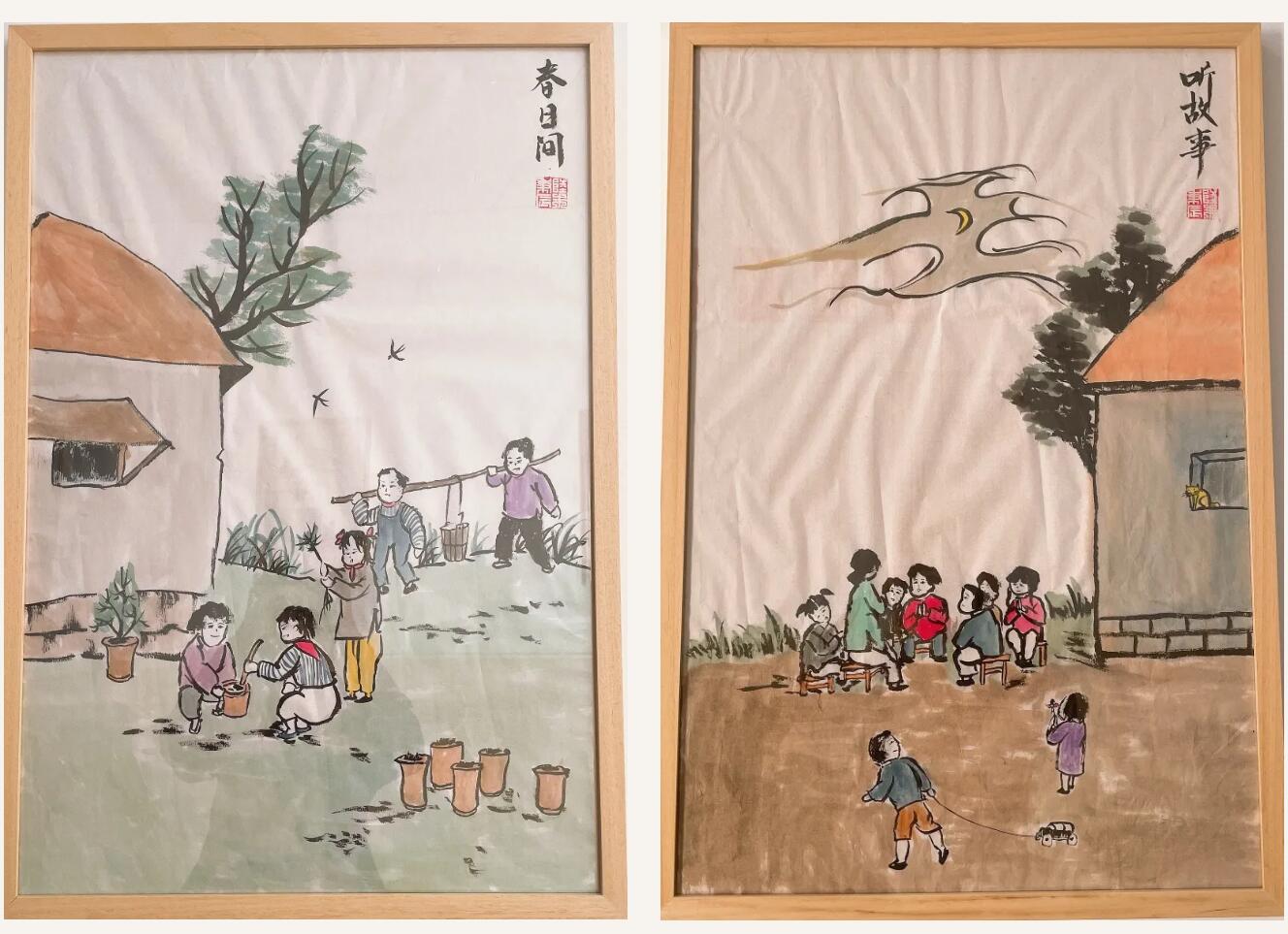 《春日間》《觀滄!贰掇r家院》《楊柳邊》……細觀這些展出的畫作,樸實、溫馨而自然的畫面,讓人感受到童年生活的美好,展現了兒童獨特的視角和爛漫的天性。每一幅都頗有緣緣堂遺風,令人想起豐子愷的《護生畫集》。