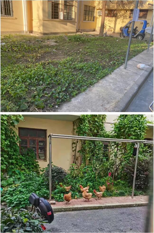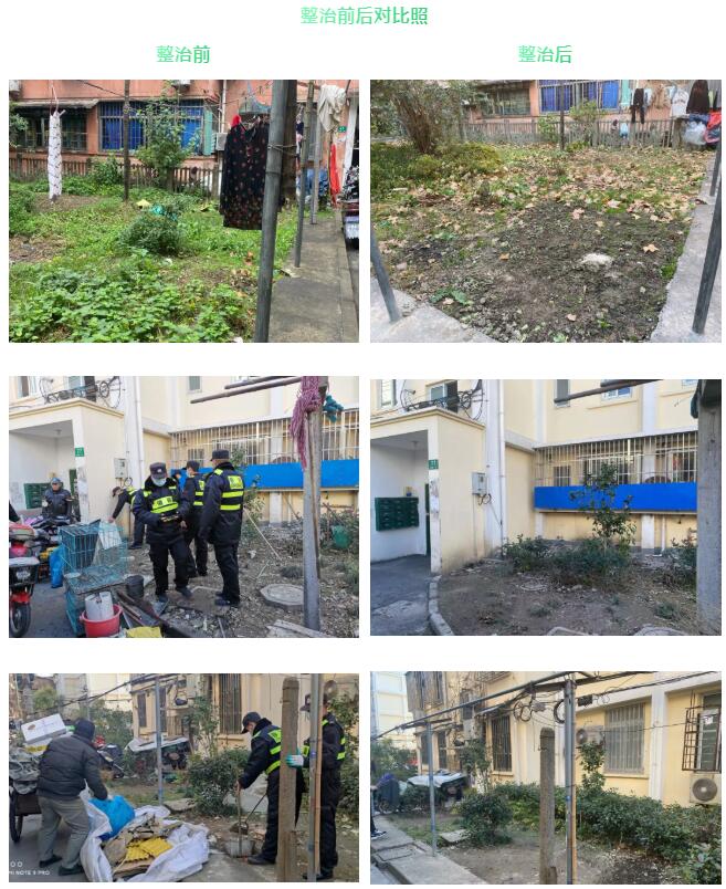 12月1日一早,由泗塘居民區書記帶隊,居民區工作人員同城管、特保、物業等相關部門兵分幾路,一路人由居民區書記帶隊上門告知,另一路負責整治工作具體執行,對綠化帶的蔬菜及堆物進行清理,另有一路人上門勸說養雞居民處理掉散養在外的雞。在清理過程中,居委在城管、特保、物業等相關部門的協同下,綠化帶垃圾、毀綠種菜等不文明現象得到了有效遏制,相關點位被全部清理干凈。