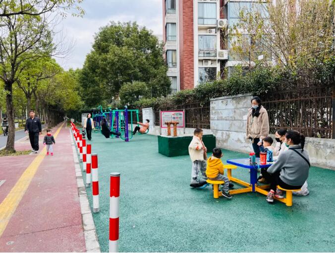 在美丹路羅迎路路口,新建成的羅店鎮順馳居委第二市民益智健身苑也成為周邊居民鍛煉的好去處。這里由一片荒地改造而來,設置了健騎器、前推下拉訓練器、快樂大轉盤等健身運動設施,經過的行人,出門溜娃的居民都可以在這個健身點找到樂趣。