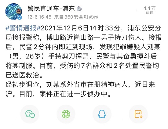 人民網上海12月6日電 (王文娟)據上海市公安局浦東分局消息:2021年12月6日14時33分,浦東公安分局接報警稱,博山路近崮山路一男子持刀傷人。接報后,民警2分鐘內即趕到現場,發現犯罪嫌疑人劉某(男,26歲)手持剪刀揮舞,民警與其奮勇搏斗后將其制服。目前,受傷的7名群眾和2名處置民警均已送醫救治。