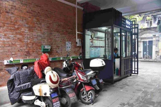 更新后的門衛房不僅為弄堂通行空出了地方,而且保安坐在里面時視野角度更大。門衛房后面則規劃了電瓶車充電樁、單車統一停放區。