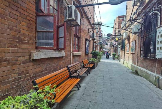 比如,干凈整潔的主弄堂里,安置了幾個長凳子、花架。陽光明媚的午后,老人們坐在凳子上閑聊、織毛衣。