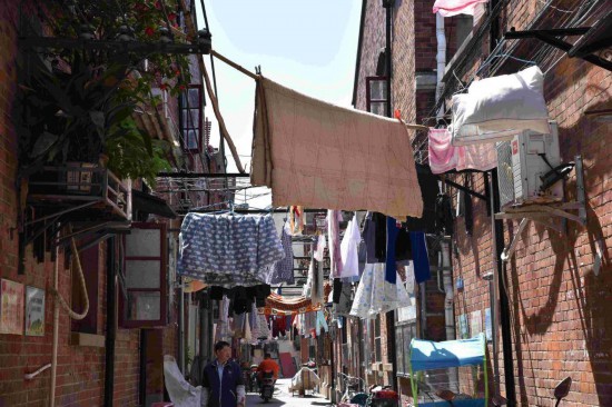 密密麻麻的電線桿上大褲衩迎風飄揚;地面積水嚴重,泥濘不堪;使用木馬桶,垃圾桶臟污,一路坑坑洼洼;“僵尸”自行車銹跡斑斑,在弄堂的各個角落里見縫插針;唯一稍微寬裕些的主弄堂,被家家戶戶門口各種大小形態的水槽和堆物逼得必須側身才能走到底……