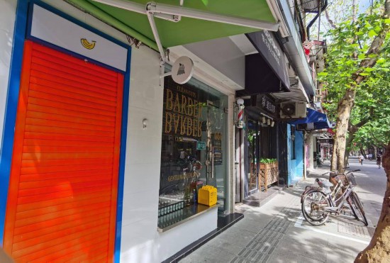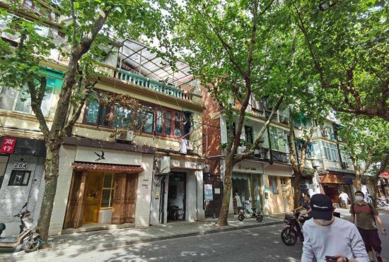 沿著新天地地鐵口前行,梧桐掩映下的淡水路充滿風情,拉毛的淺黃色外墻在樹葉的光斑中映射出騎手、步行者、汽車往來的剪影。
