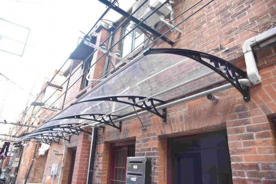 團隊給雨棚設定了幾個標準:為了不遮擋紅磚和陽光,以透明偏茶色為主。同時材料得有一定軟度,如此雨點滴落聲音較輕?蚣芙饘俦仨毞冷P。