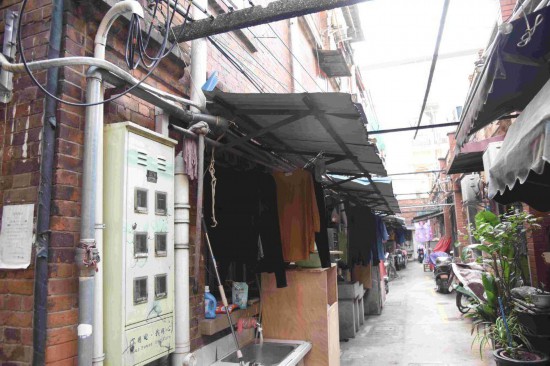 還比如家家戶戶門口的雨棚,也和此前的水槽一樣顯得亂七八糟。有幾戶的雨棚遮住整條弄堂的橫截面,遮擋有限的陽光;有幾戶頂上沒有雨棚;還有幾戶雨棚臟污破爛卻還半掛在那里,存有安全隱患。