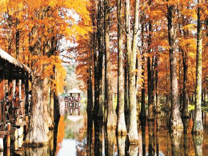 近日,青浦區青西郊野公園內的“水上森林”迎來最佳觀賞期:層林盡染,色彩斑斕,游人徜徉其中宛若“畫中游”。