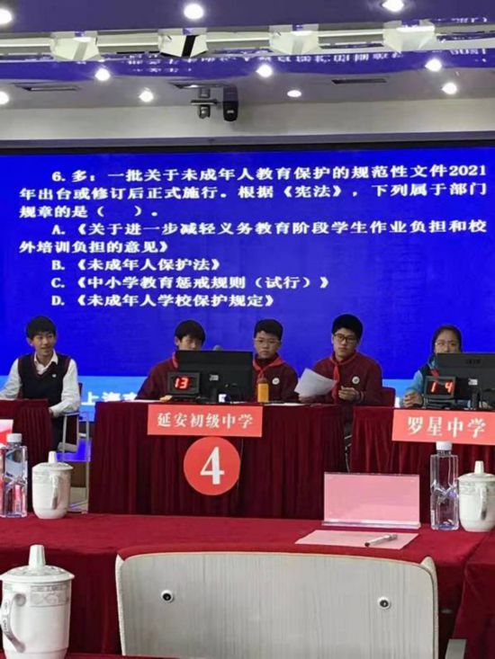 今年的決賽現場,《憲法》《民法典》、新修訂的《未成年人保護法》《預防未成年人犯罪法》《刑法修正案(十一)》以及《上海市非機動車安全管理條例》等新法新規,均在題目中得以很好地呈現。同時,根據青少年法宣活動“線上線下共同發展”的要求,今年“新滬杯”中學生憲法法律知識競賽的網絡答題部分已整體納入全國學生“爭當憲法衛士”活動。截至目前,全市參與教育部“憲法衛士”網絡競賽的大中小學生超過143.23萬名,在全國位居前列。此外,市教衛工作黨委、市教委還配套開展了上海大學生法治辯論邀請賽、青少年憲法法治優秀書畫作品征集等活動,并組隊參加全國學生“學憲法·講憲法”比賽,獲得優異成績。